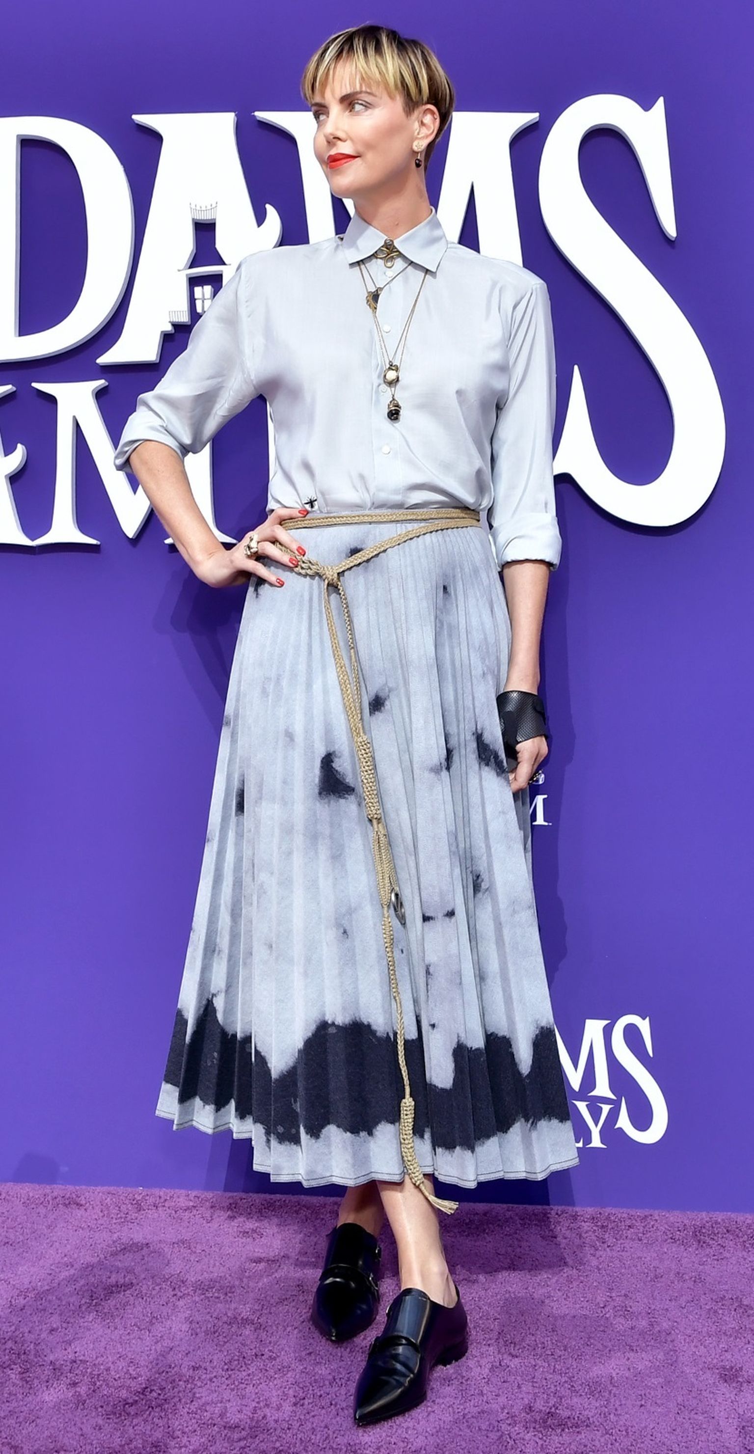 • Charlize Theron na premijeri filma 'Obitelj Adams' u plisiranoj suknji modne kuće Dior Foto: Getty Images