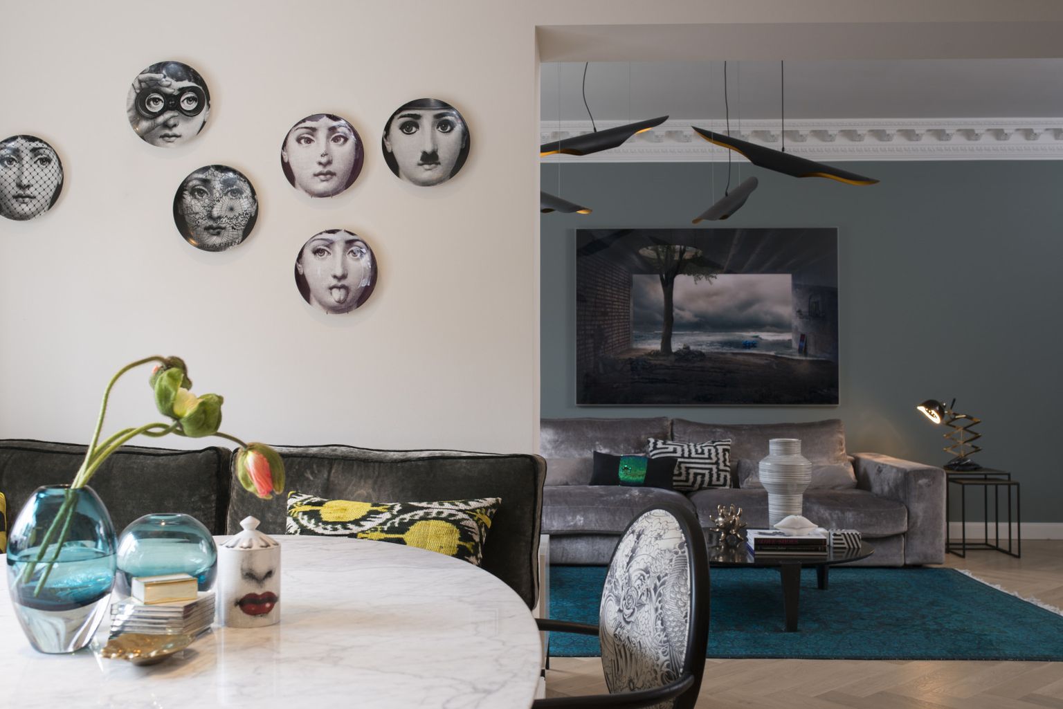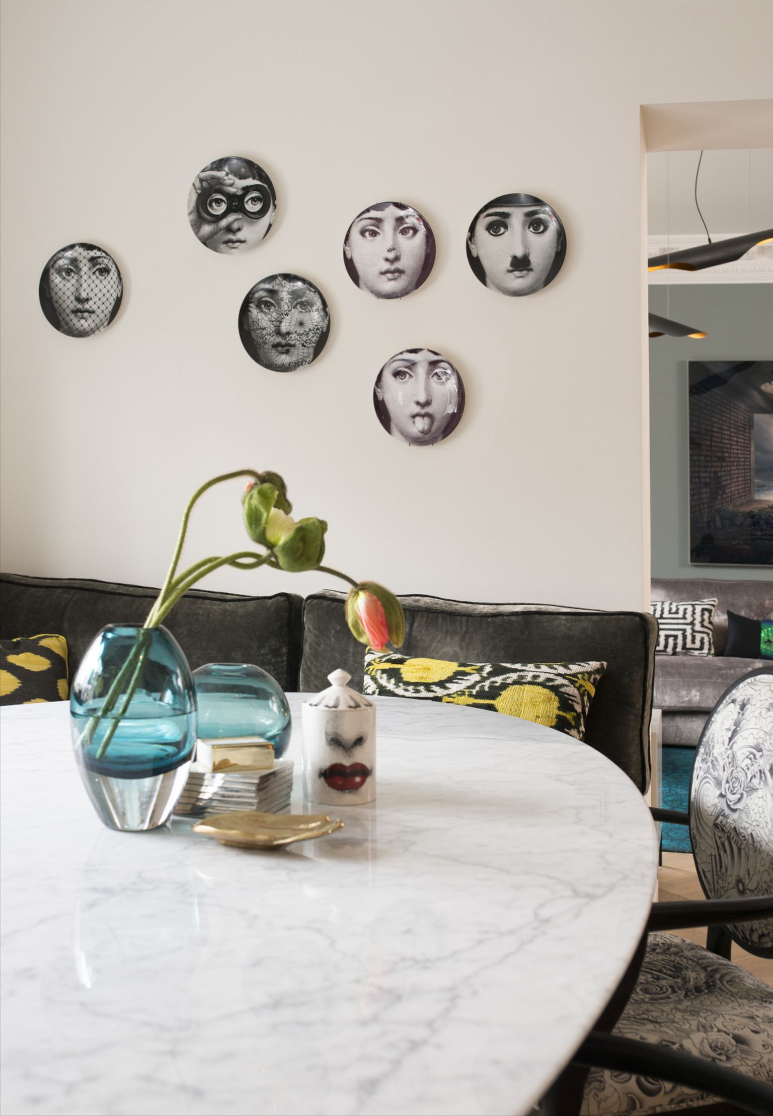 Dekorativni tanjuri s ilustracijama lica i umjetničke fotografije na zidovima otkrivaju sklonost vlasnika prema dizajnu i estetici