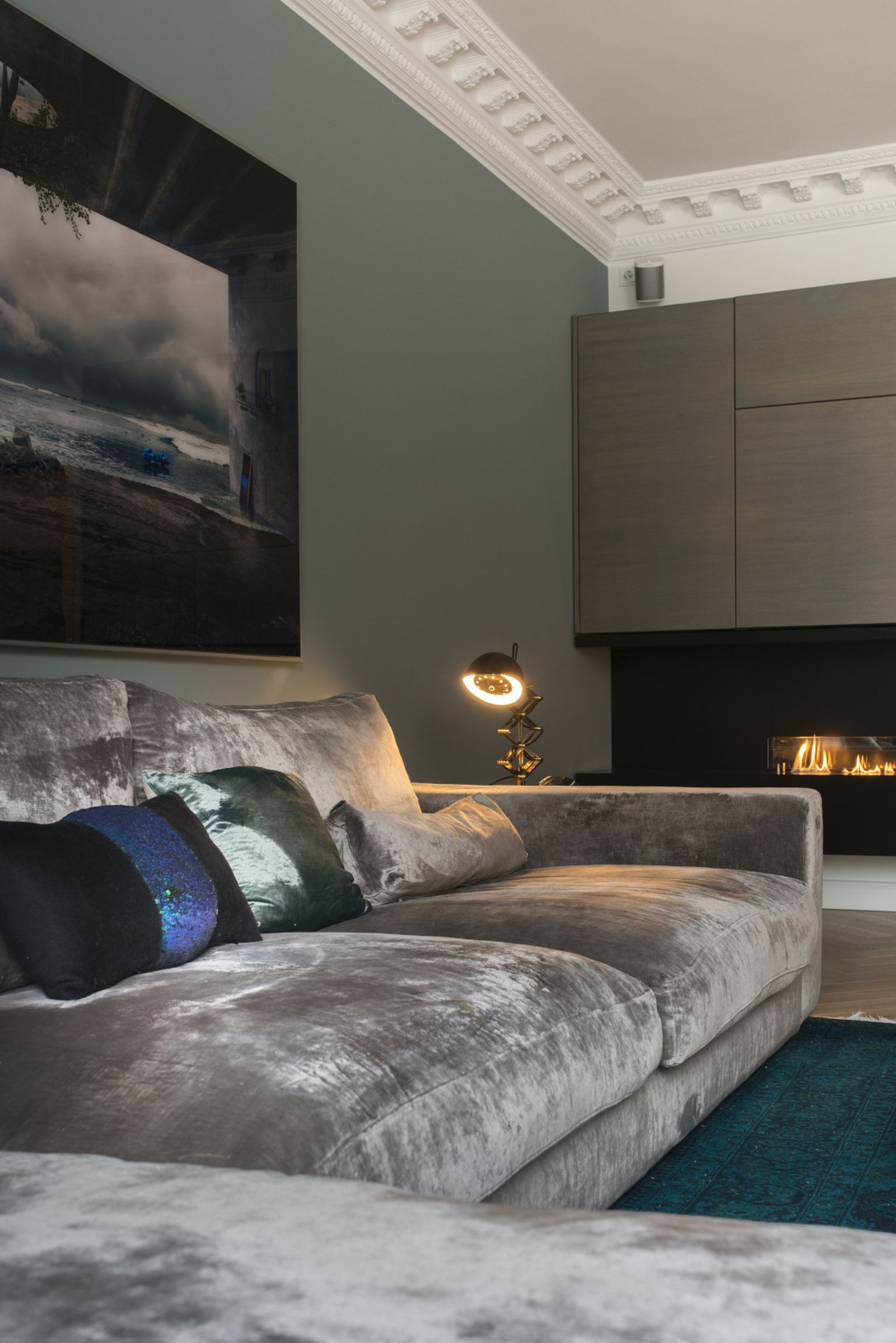 Elegantan stan u kojem su baršunasta kutna garnitura i električni kamin glavne zvijezde
