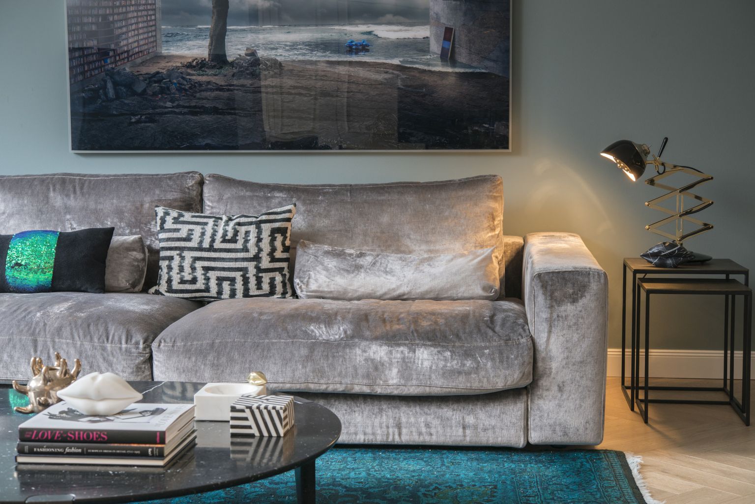 Baršunasta kutna garnitura u sivoj nijansi poziva na odmor, a njezina raskošna tekstura unosi toplinu i taktilnu ugodu u prostor