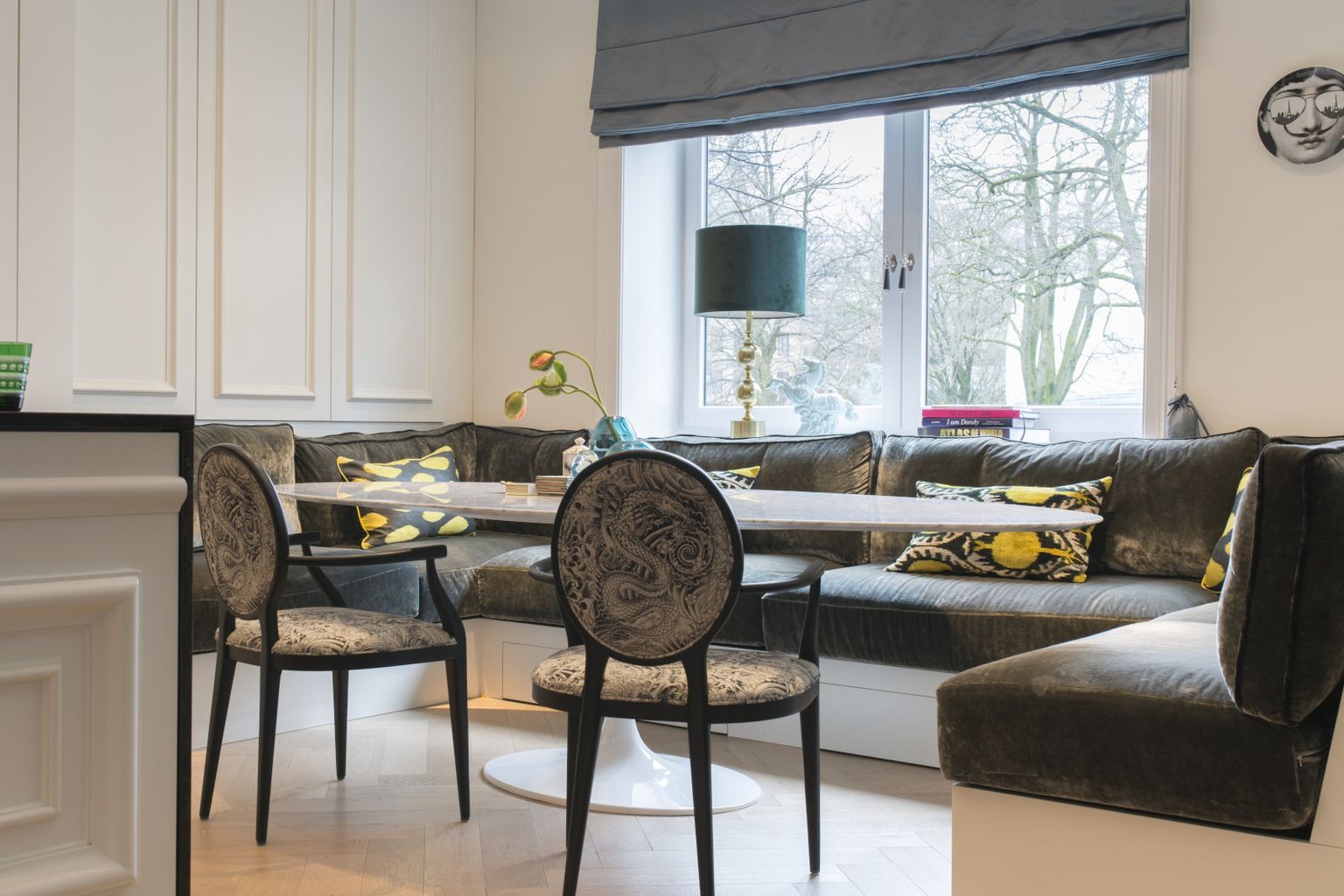 U blagovaonici se ističu tapecirane stolice s elegantnim printom te cozy kutna klupa koja spaja estetiku i funkcionalnost