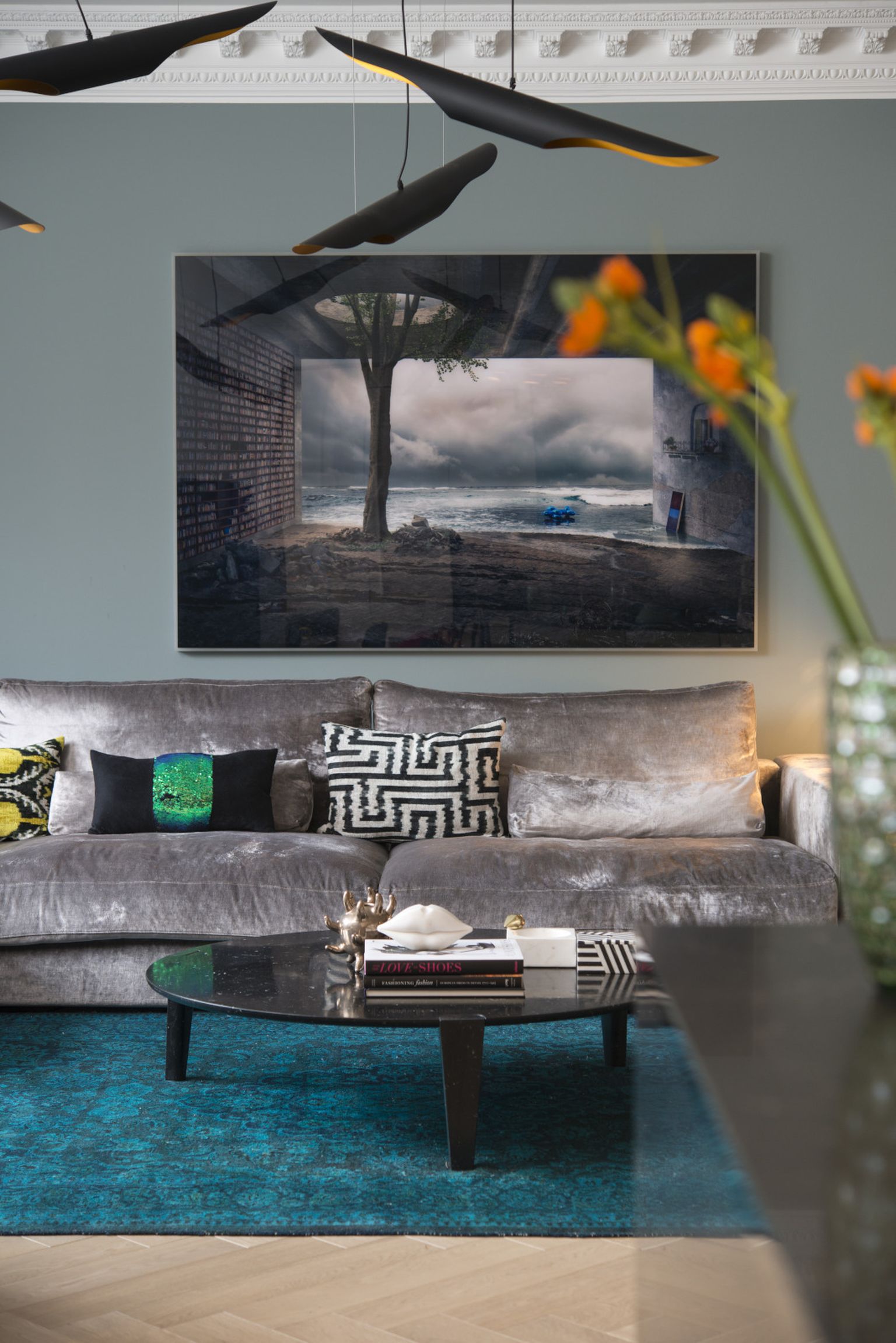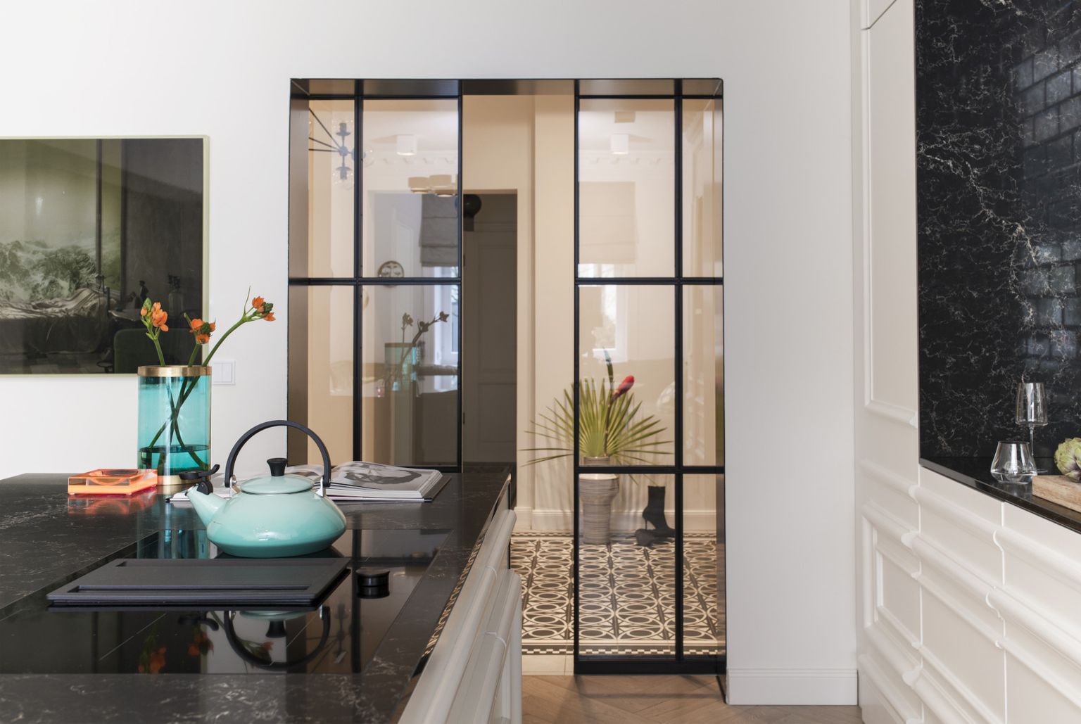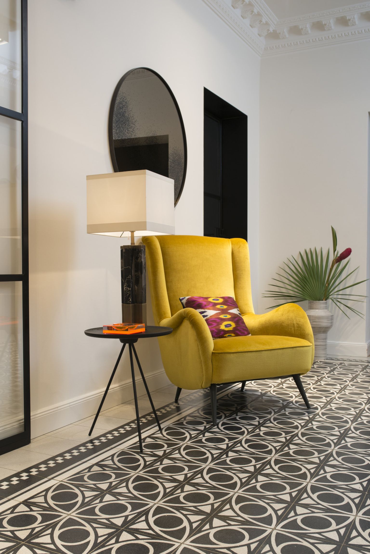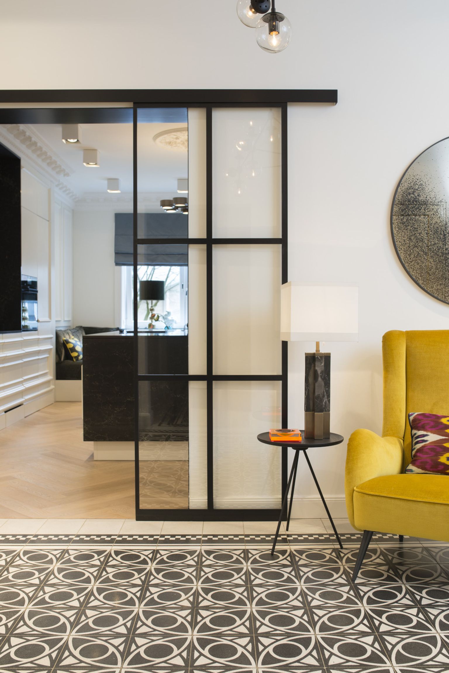 U stanu dominiraju neutralni tonovi, bijela, siva i crna, koje povremeno prekida vibrantna žuta ili tirkizna