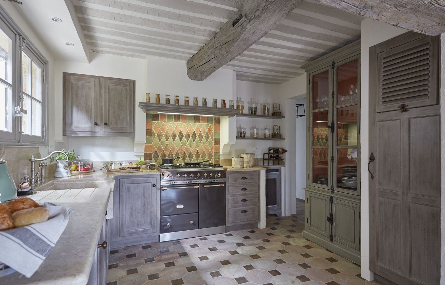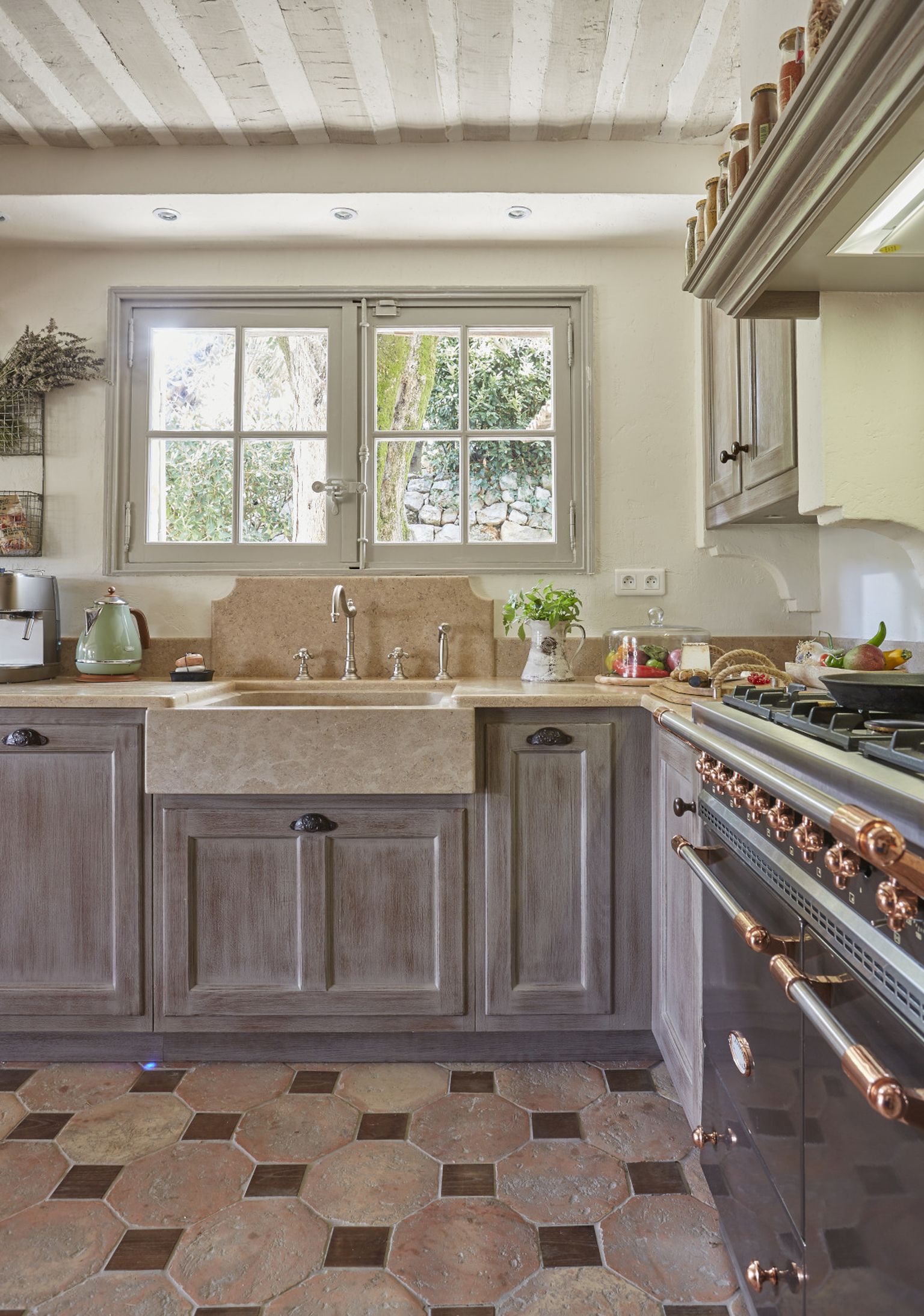 Kuhinja izgleda kao iz francuske seoske bajke, s retro štednjakom i keramičkim sudoperom uokvirenim drvom i kamenomFoto: