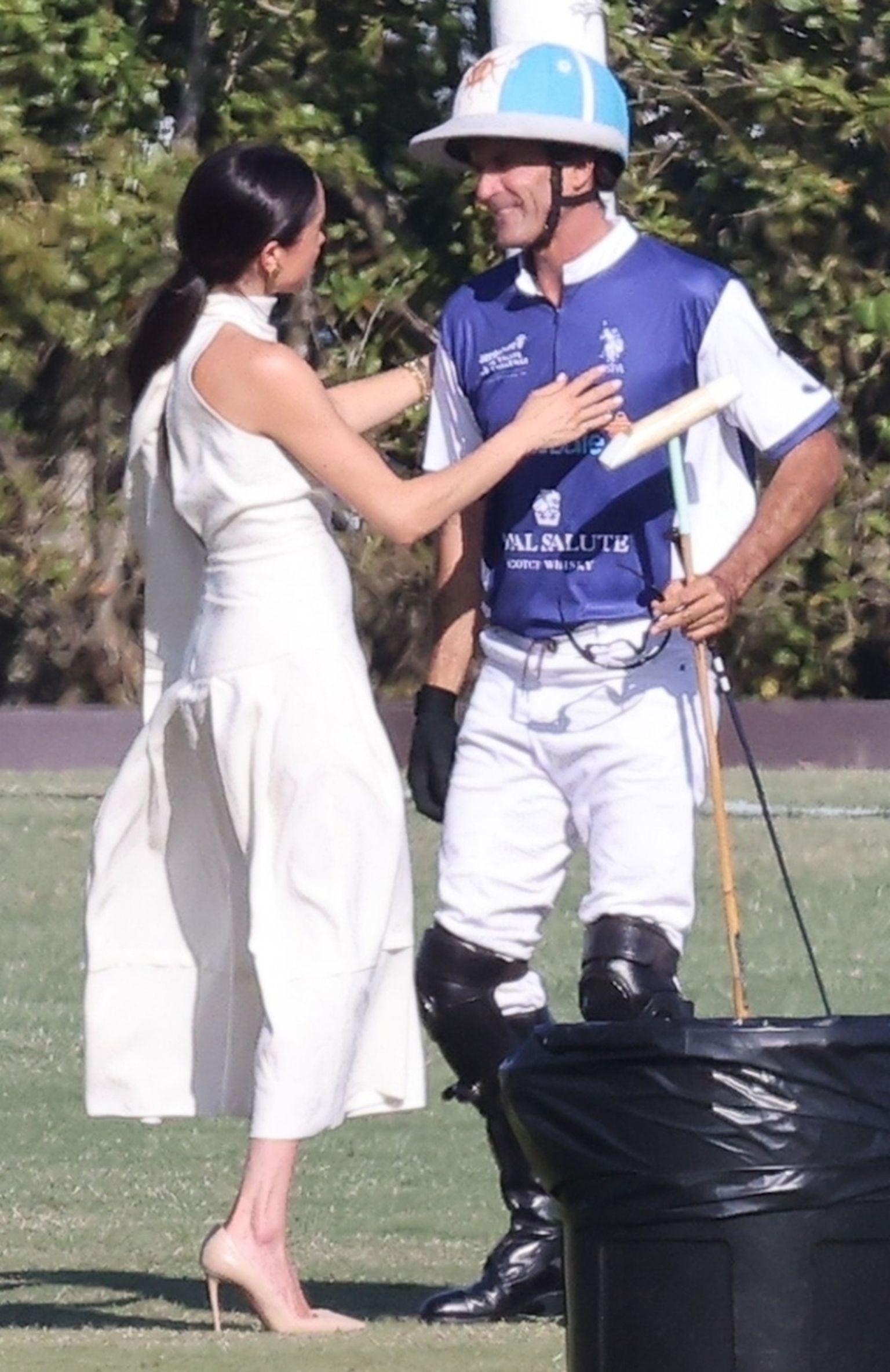 • Meghan Markle na polo utakmici u bijeloj haljini dizajnerice Heidi Merrick i štiklama brenda Aquazzura Foto: Profimedia