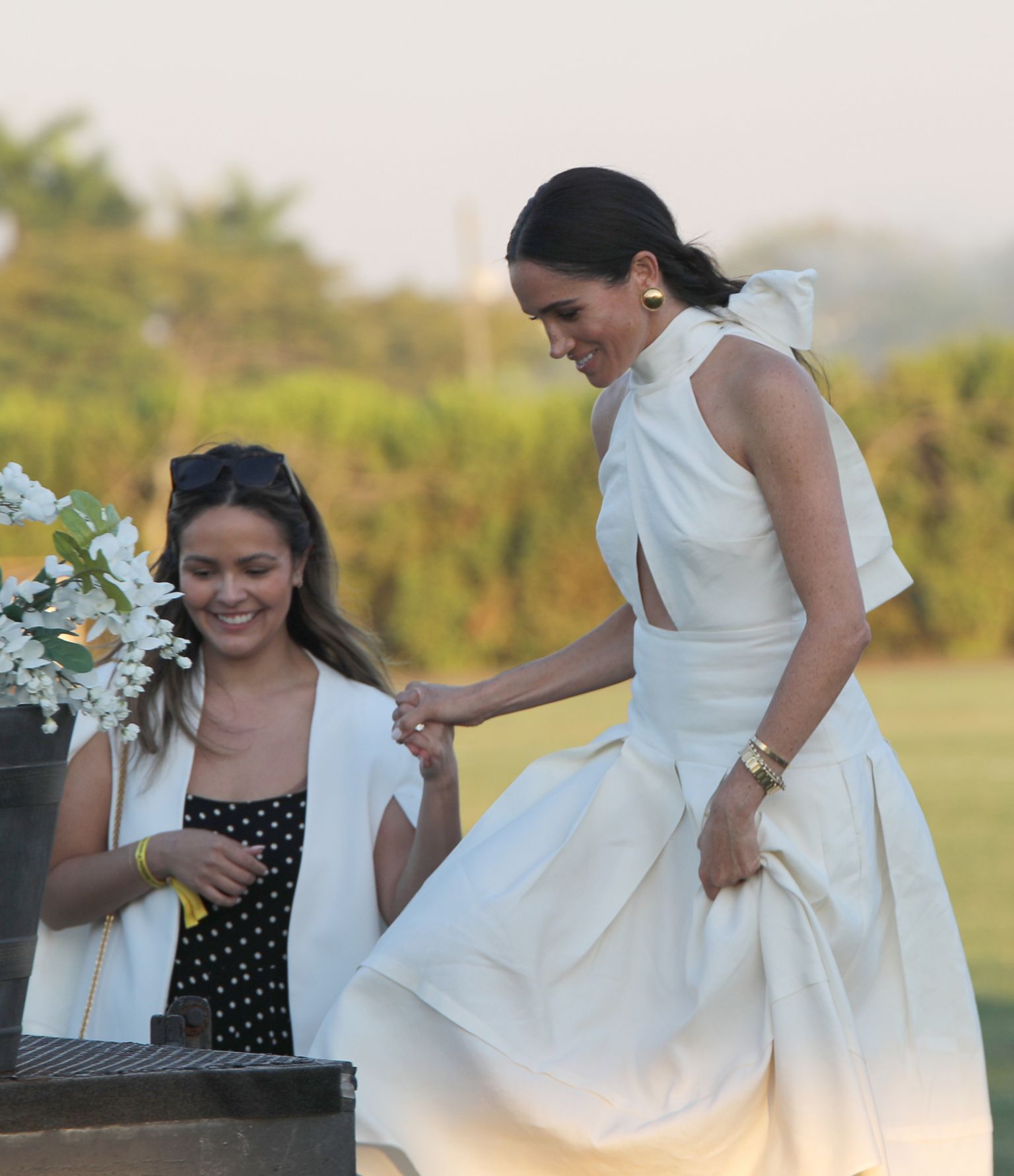 • Meghan Markle na polo utakmici u bijeloj haljini dizajnerice Heidi Merrick Foto: Profimedia