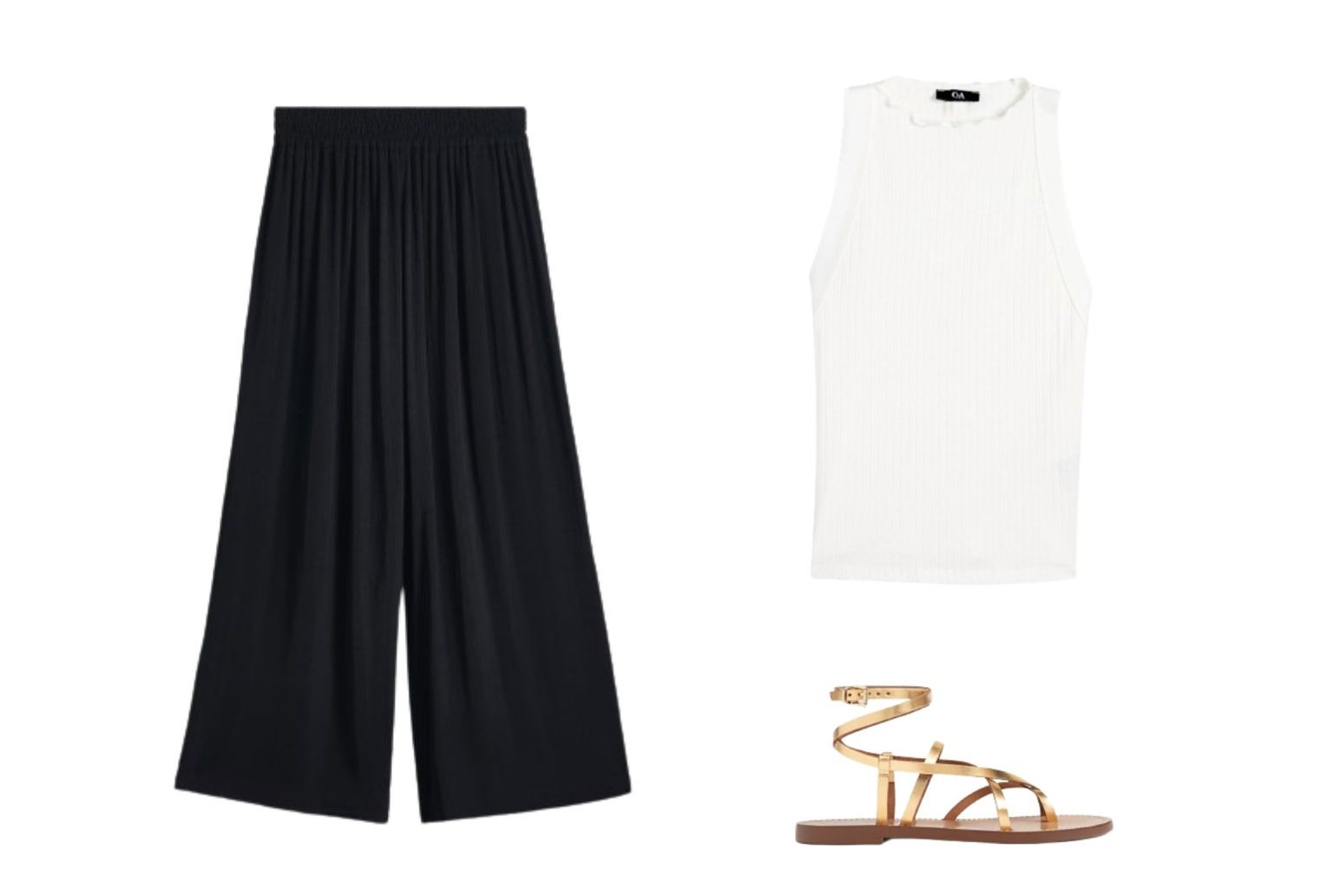 Bijeli top + hlače širokih nogavica + ravne sandale