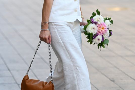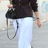 Bijeli top + hlače širokih nogavica + ravne sandale