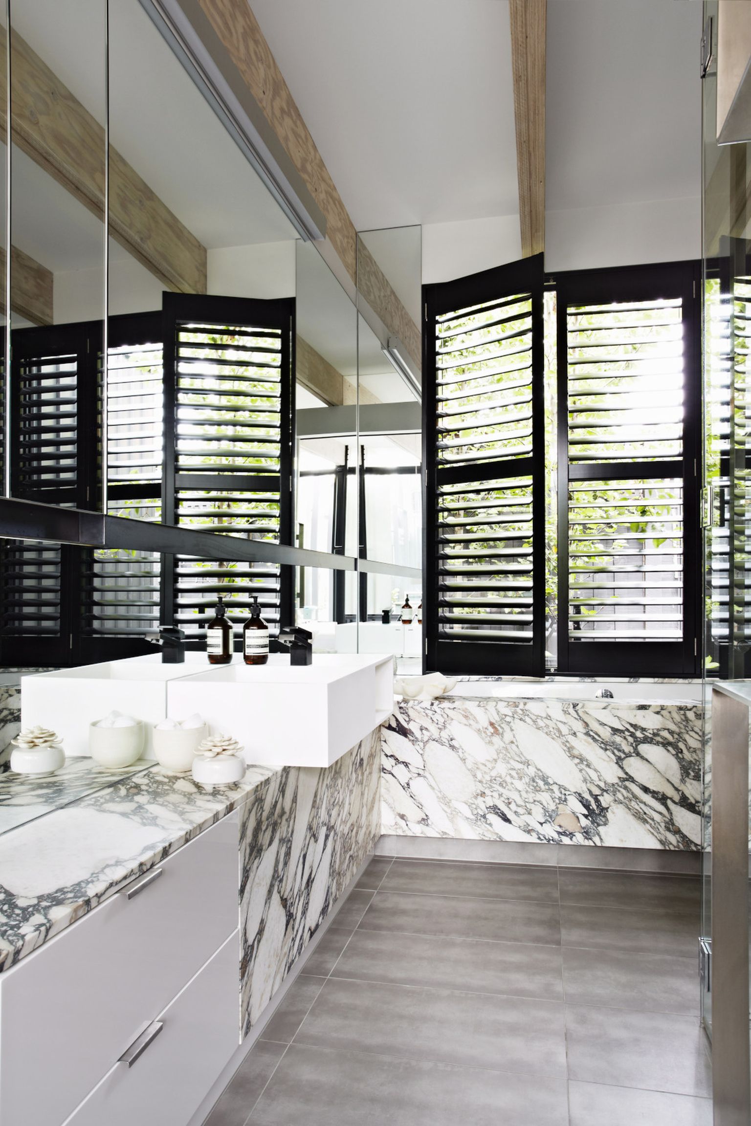 • Kupaonica s mramornim detaljima, velikim ogledalima i crnim roletama izgleda poput boutique spa zone Foto: Living4media