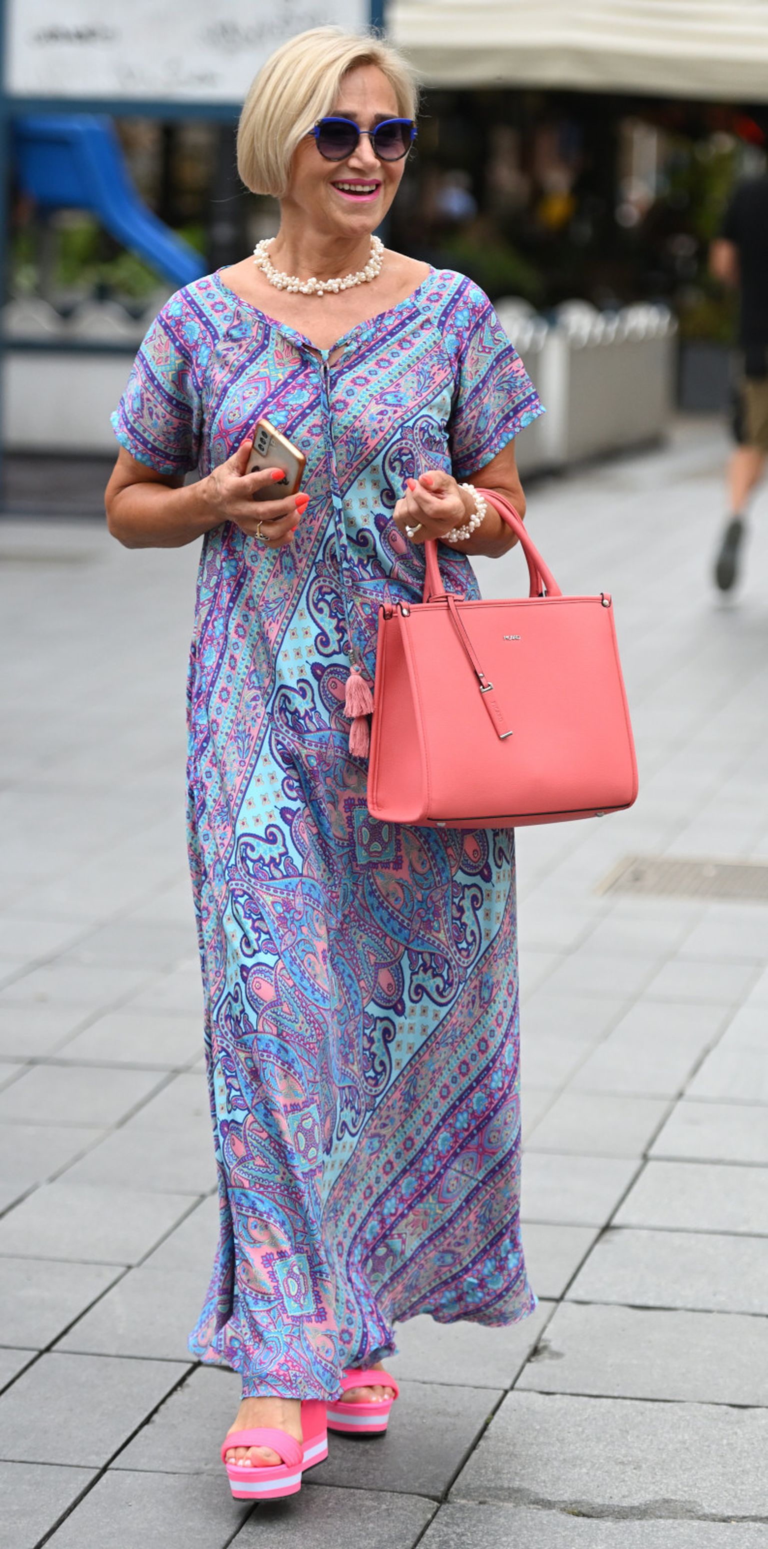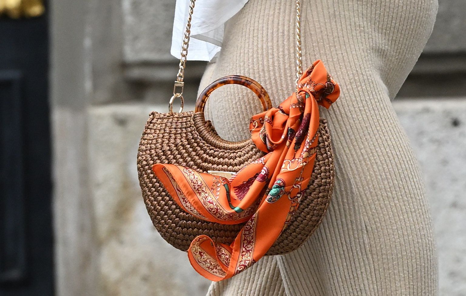 • Street style trudnica nosi pletenu torbu ukrašenu narančastom mašnom Foto: Josip Moler/Cropix