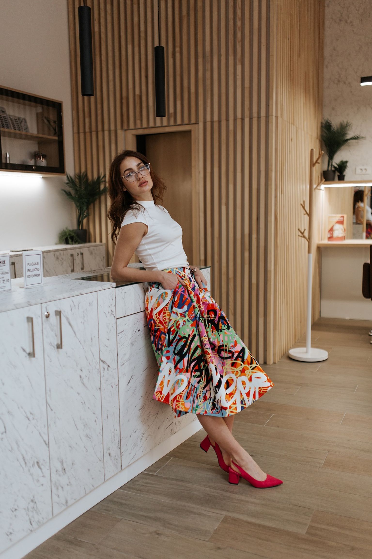 Majica Mohito 12,99€ / 97,87kn, suknja Mohito 34,99€ / 263,63kn, cipele Reserved 35,99€ / 271,17kn, dioptrijske naočale Dolce & Gabbana, Optika Anda 205,00€ / 1544,57kn